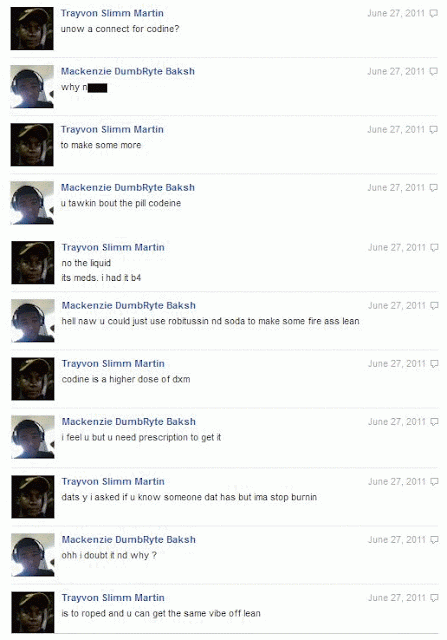 Update…google Trayvon’s facebook page…he was a bog time Lean user. His autopsy showed severe liver damage (google it, i ain’t your mother) which was attributed to using ‘street drugs’.